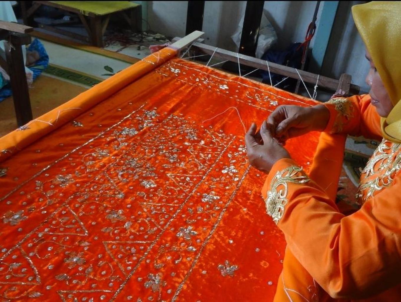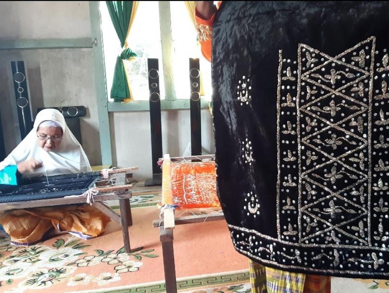 Wisatawan dapat belajar cara menyulam menggunakan kelengkang(benang perak). Berfoto menggunakan baju adat melayu setempat