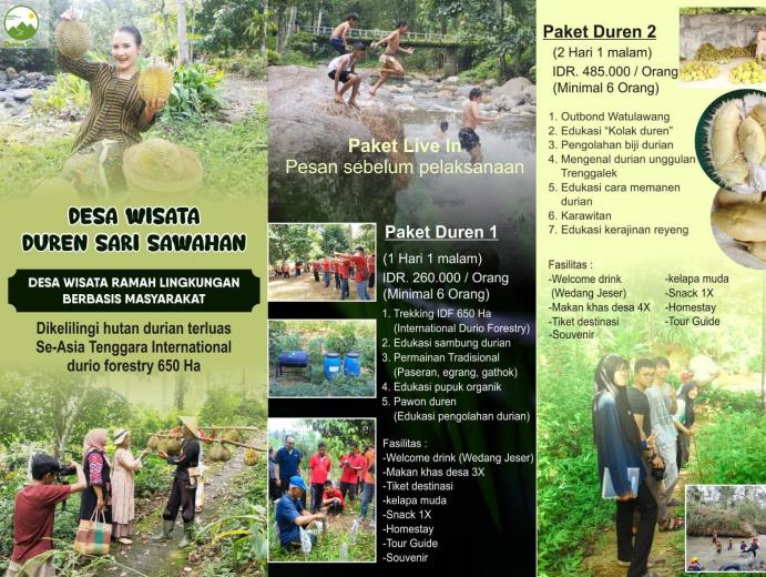 Desa Wisata Duren Sari Sawahan merupakan salah satu desa wisata terbaik nasional tahun 2020 dengan konsep CBT (Community Based Tourism). Nama Duren Sari dipilih karena desa ini berada di kawasan hutan durian terbesar se-Asia Tenggara seluas 650 Ha yang telah ditetapkan sebagai International Durio Forestry (IDF) oleh Menteri Pertanian pada tahun 2016. Kita bisa melihat durian yang bergunung-gunung di teras rumah warga pada musim durian.