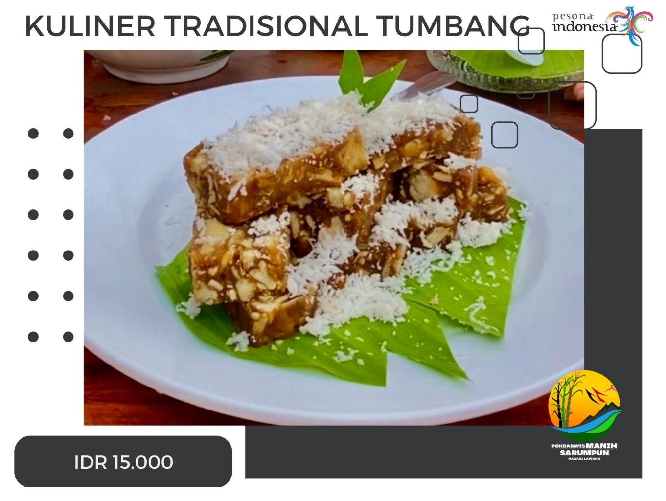 Tumbang termasuk kuliner yang khasnya nagari lawang yang telah ada dari zaman belanda dan jadi santapan yang menguguah selera, terbuat dari ubi kayu yang di masukan saat air tebu mendidih dan setelah matang nantinya dipotong dan dibentuk kotak-kotak, karena dimasak dengan air tebu rasa yang di hasilkan pun manis dan sangat enak, para pengunjung desa wisata puncak lawang dapat memesan kuliner Tumbang ini. dan juga bisa melihat proses pembuatanya.