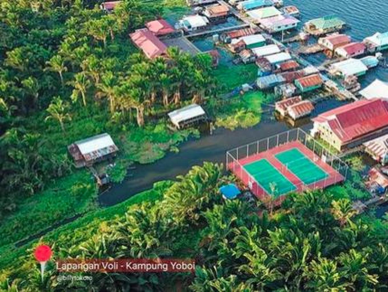Lapangan bola voli terapung di kampung Yoboi sangat unik karena bermain dan berolaraga dilakukan diatas danau Sentani atau dilakukan diatas para-para