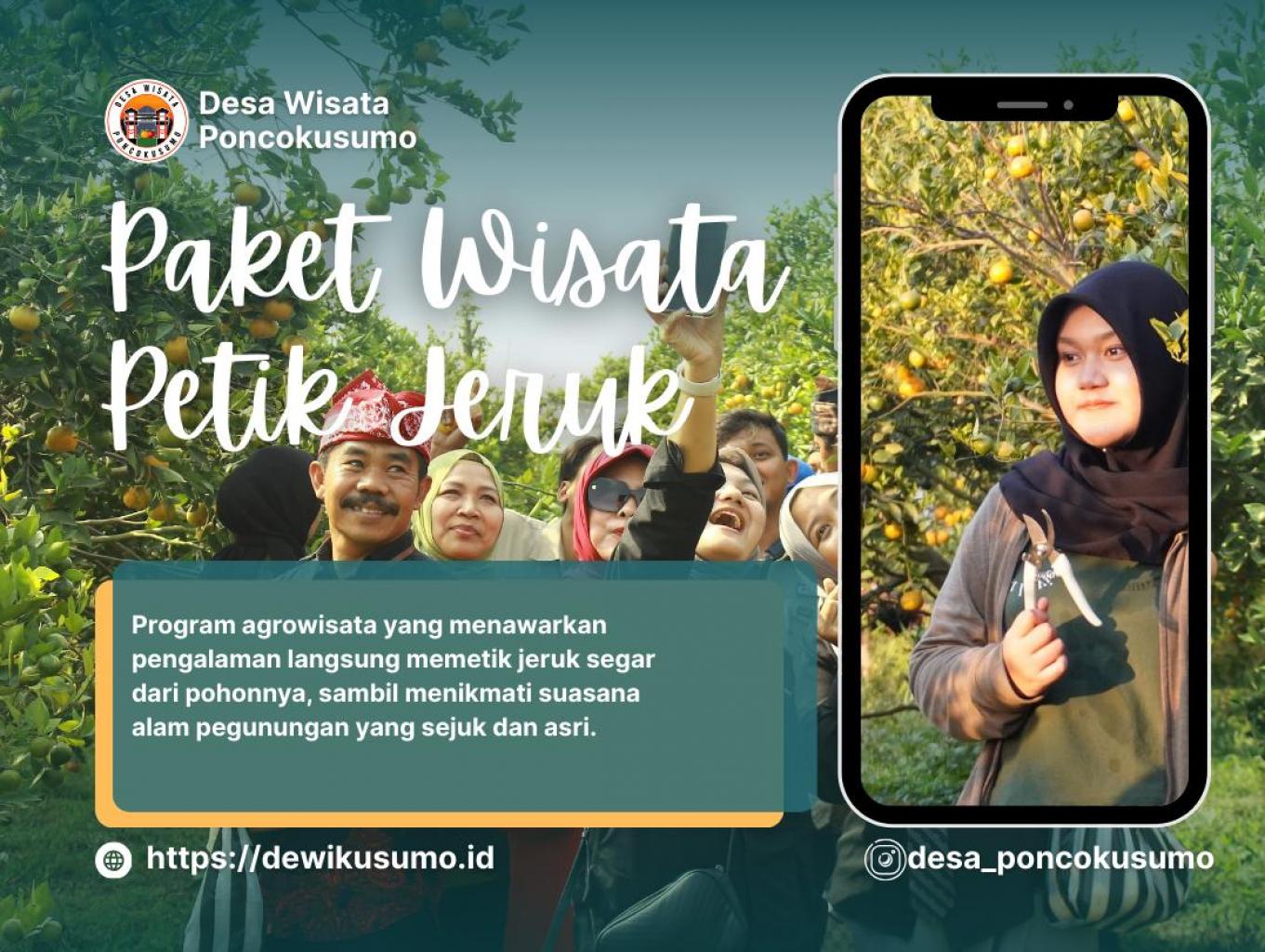 Program agrowisata ini mengajak pengunjung merasakan langsung kesegaran memetik jeruk dari pohonnya di tengah hamparan kebun yang hijau, sambil menikmati udara pegunungan yang sejuk dan panorama alam yang asri sebuah pengalaman edukatif dan menyegarkan khas desa wiisata Poncokusumo.